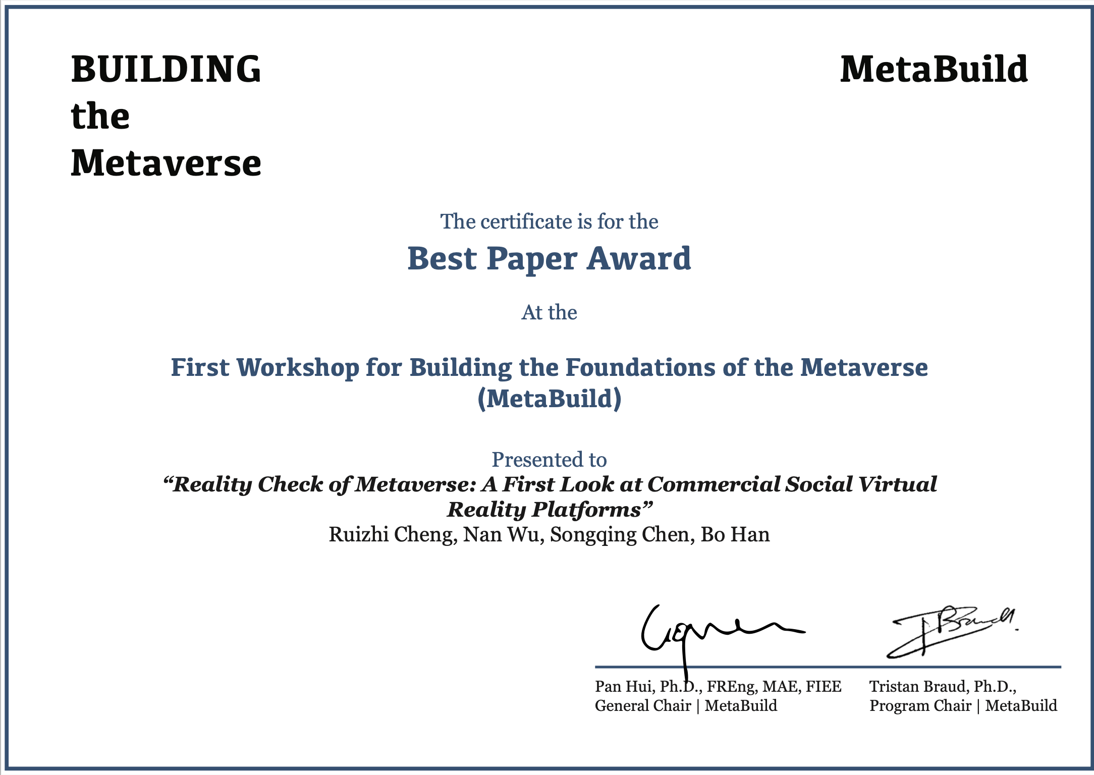 Ruizhi Cheng, Nan Wu, Matteo Varvello, Songqing Chen, Bo Han. "Are We Ready for Metaverse? A Measurement Study of Social Virtual Reality Platforms"