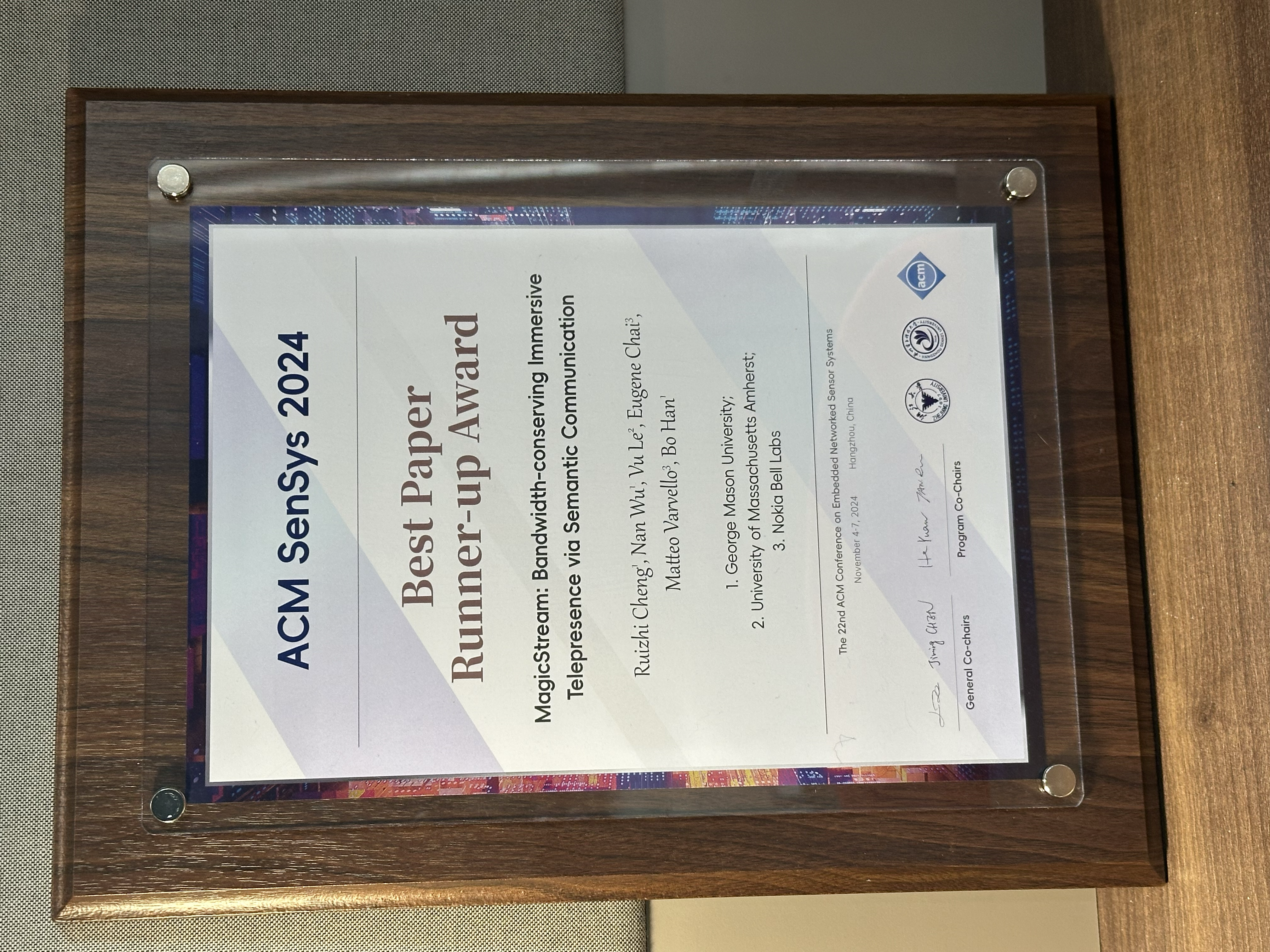 Ruizhi Cheng, Nan Wu, Vu Le, Matteo Varvello, Bo Han. "MagicStream: Bandwidth-conserving Immersive Telepresence via Semantic Communication" [Best Paper Runner-up]